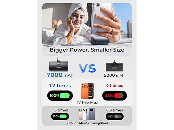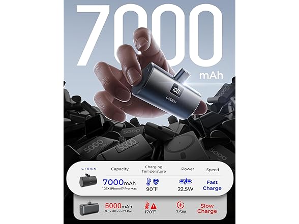 7000mAh Mini Portable Charger USB C Power Bank for iPhone 17 Pro Max 22.5W Fast Charging[USB-C Only, No Cable Needed], LISEN for iPhone 17 Pro Max 16 15, Samsung,Pixel, iPad, AirPods