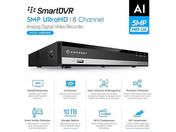 AMCREST MODEL: AMDV5M8 DVR FEATURES: View and Record in Widescreen with Remote Viewing on iOS, and Android devices (with included Amcrest View Pro app) Supports up to 10TB Storage for Continuous Recording at 8CH 5MP @25/30fps (Hard Drive Not Included) Supports Long Distance Signal Transmission up to 2296 ft Intelligent Video Footage Search and Playback Smart Motion Detection, Differentiate between himan and motor vehicle shapes within a scene and receive alerts only when a person or vehicle is detected AI Features include Face Detection , Face Recognition & Smart Motion Detection IVS Features include Tripwire and Intrusion H.265 Compression Technology USB Backup Feature for Peace of Mind This product may contain components which are not NDAA compliant Supports all Amcrest Analog Cameras with Limited Compatibility to third-party Analog Cameras PACKAGE INCLUDES: 1 x 5-Megapixel 8-Channel DVR (AMDV5M8) Lifetime Technical Support from Amcrest *Camera Power Supply and Coaxial Video Cables are NOT INCLUDED but are Required and SOLD SEPARATELY.*