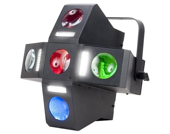 The higher output ADJ Monster Fun is a 2-FX-IN-1 DMX LED Moonflower + Strobe Lighting effect with 5 lenses and 4 strobe strips. It features 25x 1-Watt red, blue, green, white and amber colored LEDs.