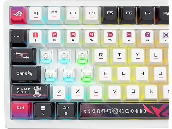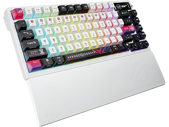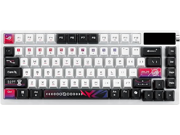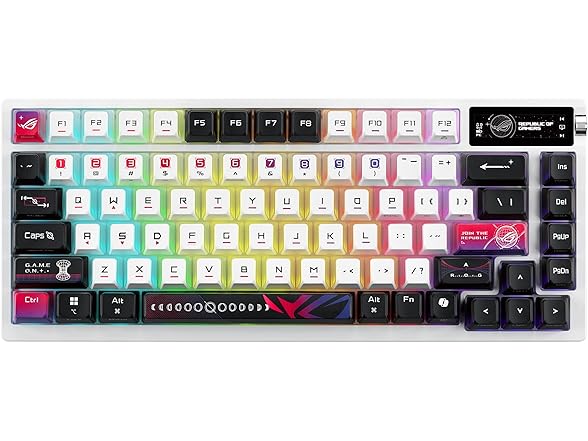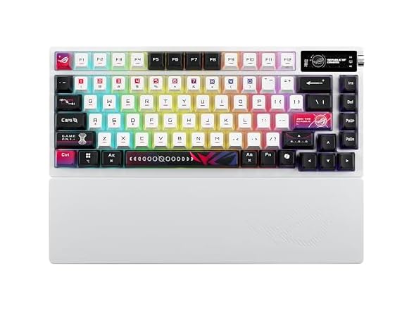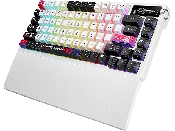 ROG Azoth X 75% custom gaming keyboard, hot-swappable Storm V2 Switches, gasket mount, dampening foam, FR4 plate, south-facing PCB, tri-mode connection, OLED display, control knob, wrist rest, Mac