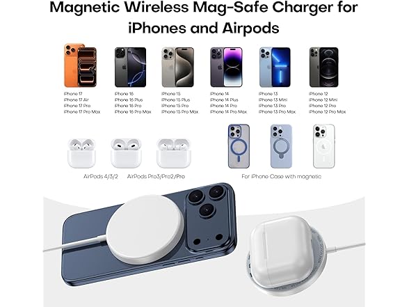 - 【Customized for 17/16/15/14/13/12 Wireless iPhone Charger】The Magsafe wireless Charger iPhone specially designed for iPhone 17/ 17 Pro/17 Pro Max/ 17 Air,16/ 16 Pro/16 Pro Max/ 16 Plus/16 e,iPhone 15/15 Pro/ 15 Pro Max/ 15 Plus,i Phone 14/ 14 Pro/ 14 Pro Max/ 14 Plus, iPhone 13 series, iPhone 12 series, AirPods 4/3/2 Pro 3/2/Pro and iPhone models with MagSafe cases. The USB-C PD 20W charger could provide 20W for wired charging and Max15W magnetic wireless charging