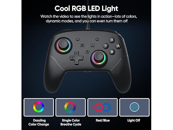 - Adjustable RGB Lighting: The wired controller features 8 colors of lighting (Blue-Red-Green-Pink-Orange-Cyan-Purple-Color Gradient) and 4 light modes: Running Lights (Dazzling Color Change)-Breathing Light (7 Colors Cycle)-Fixed Color (4 Colours Available: Colourful, Blue, Red, Left Red Right Blue)-Light Off. You can change the lighting colors and modes according to your game type or personal preferences, making the lighting complement the game atmosphere and enhance your gaming experience