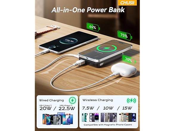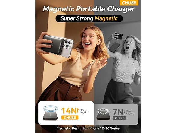 - Magnetic Power Bank — Snap On and Go: Crafted for Magsafe-compatible phones, the CHUSII magnetic power bank features a robust 14N magnetic hold for instant, precise alignment and steady wireless charging. Simply snap it on and enjoy effortless power—no cables, no outlets, no interruptions. Ideal for travel, daily commutes, and outdoor adventures, it keeps your phone powered up wherever life takes you.(*Compatible with iPhone 17/16/15/14/13/12 series. Not compatible with non-magnetic cases.)