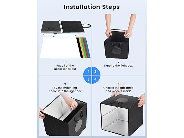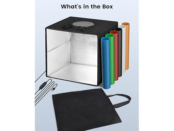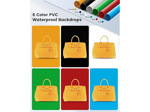 - 6 Color Backdrops: The photo box comes with 6 color detachable backgrounds: White/Black/ Orange/Blue/Green/Red, made of thicker PVC.