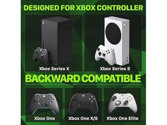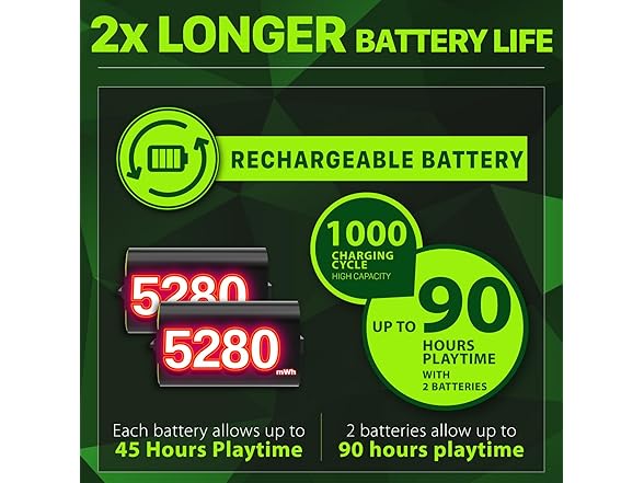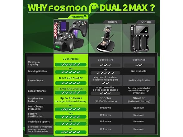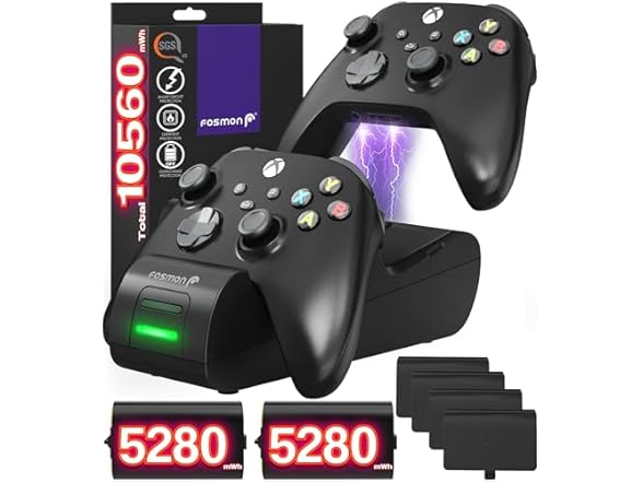 - [DUAL 2 MAX CHARGING DOCK - CERTIFIED BY SGS] Are you bothered by your controller running of out batteries when you’re in a critical part of a game? With two controller slots, two 5280mWh (2200mAh) rechargeable batteries, Fosmon’s DUAL 2 MAX controller charger provides you endless gaming time without having to worry about running out of batteries. Compatible with New Xbox Series X/S, Xbox One, One S, One X, Elite Controller. Not compatible with the Xbox Elite 2 controller.