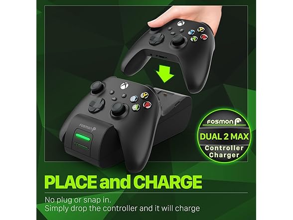 - [PLACE AND CHARGE] Fosmon’s DUAL 2 MAX Charging Dock makes it easy to charge your controller. Simply place your controller on the charging dock and the controller will align with the metal conductor and start charging. The charging dock can house your controllers when not in use, making it easy to locate them when they're needed.