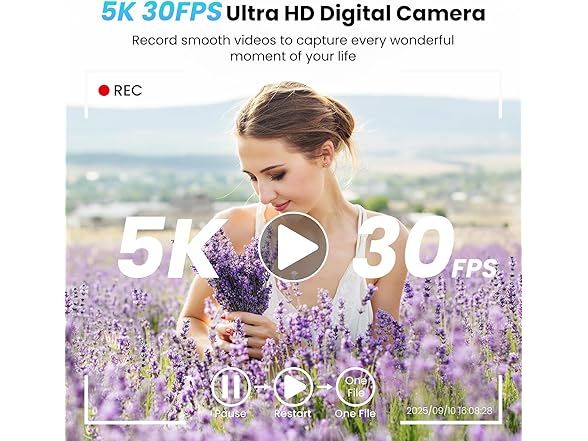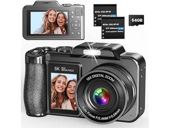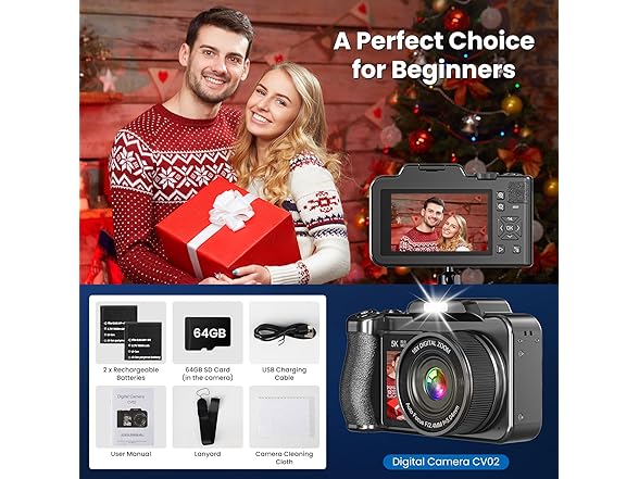 - Perfect Gift: This compact digital camera is perfect for everyday use and travel, easily slipping into your bag. You can get a 5K digital camera, a 64GB card, two batteries, a USB cable, a user manual, a lanyard, and a lens cleaning cloth. This 5K camera's ease of use and versatility make it a perfect gift for Christmas, Mother's Day, Father's Day, Birthday, Halloween, and more.