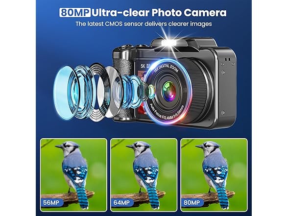 - 5K 80MP Autofocus Digital Camera with Flash: This upgraded camera shoots 5K Ultra HD video and 80MP photos. It features fast autofocus, allowing you to lock focus with a simple half-press of the shutter button. Built-in flash ensures high-quality photos even in low-light conditions, making it ideal for both indoor and outdoor use. Whether you're capturing memorable moments or breathtaking landscapes, this camera is the ideal choice for photographers who demand exceptional image quality and user-friendly operation.