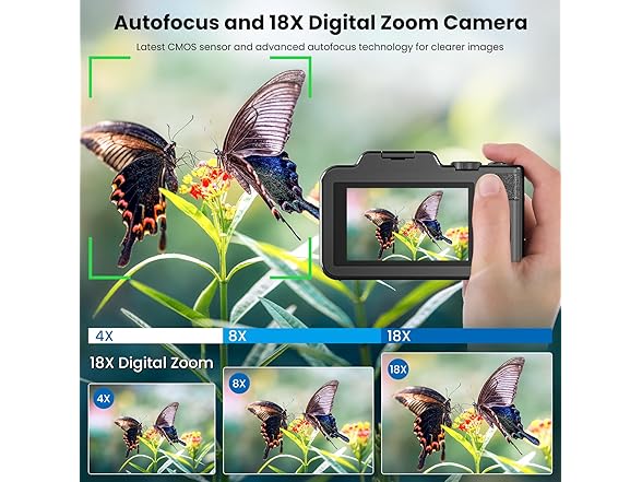 - Digital Camera with 18X Digital Zoom: This cameras for photography come with two screens. The dual-screen design makes it easy to record selfies, making it an ideal choice for selfie enthusiasts. This camera features 18x digital zoom, allowing you to easily zoom in or out during photo or video capture with the touch of a button, making it easy to capture distant scenery in sharp detail.