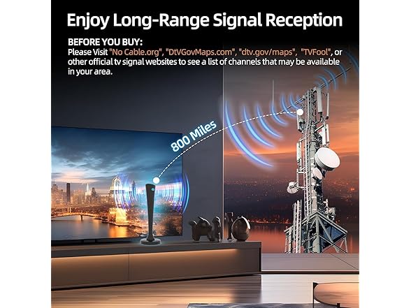 - ⚜️Long-Distance Reception :This digital TV antenna indoor uses the latest digital signal processing chip and signal booster. Whether it is a close or long distance signal, it can be captured and optimized signal transmission protection to prevent other signal interference, and ensure that you can get more clear channels even if you are far away from the broadcast tower, making it perfect for family movie nights, outdoor gatherings, or camping trips. Our digital TV antenna supports a variety of signal transmissions, including HD, 4K and 8K. You can access hundreds of channels without any pixelation, making your favorite TV scenes come to life.