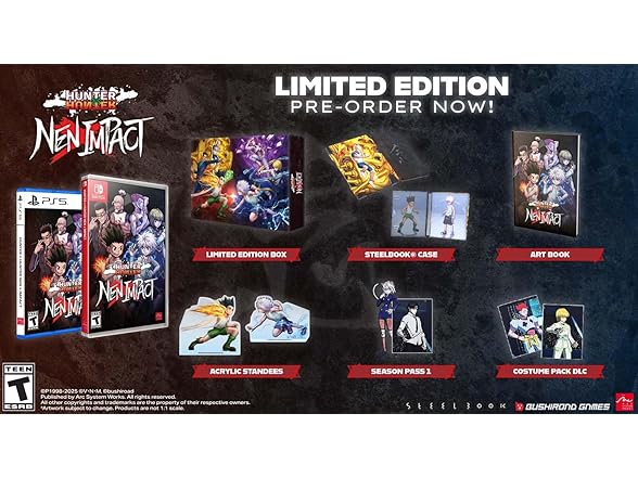 - Limited Edition includes: HUNTER×HUNTER NEN×IMPACT PS5 GAME, Limited Edition Box, SteelBook Case, Artbook, Acrylic Stands, Season Pass, Costume Pack DLC