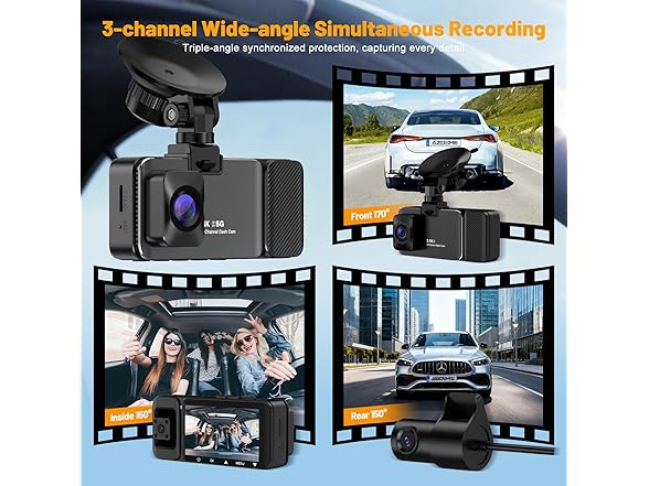 - 【Triple Ultra-Wide Angle Cameras Eliminate Blind Spots】Three high-definition wide-angle lenses work in tandem to deliver expansive views. The 170° front dashcam wide angle effortlessly covers multiple lanes, the 150° rear dashcam wide angle precisely captures approaching vehicles from behind, and with a 150° cabin wide angle dashcam, it records every seat's activity inside the vehicle, giving you full command of the panoramic road conditions.