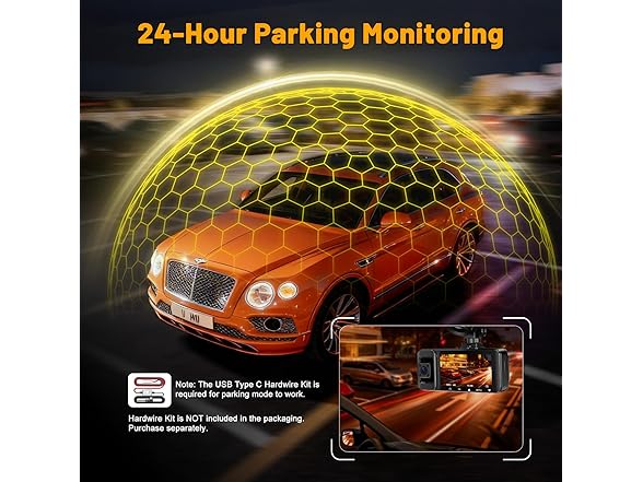 - 【24/7 Parking Surveillance】After engine shutdown, the system automatically activates 24-hour parking surveillance mode. Three lenses continuously monitor the vehicle's surroundings, effectively preventing accidental scrapes and providing uninterrupted peace of mind. (Requires separate purchase of 5V/2A Type-C hardwiring kit to enable this feature)