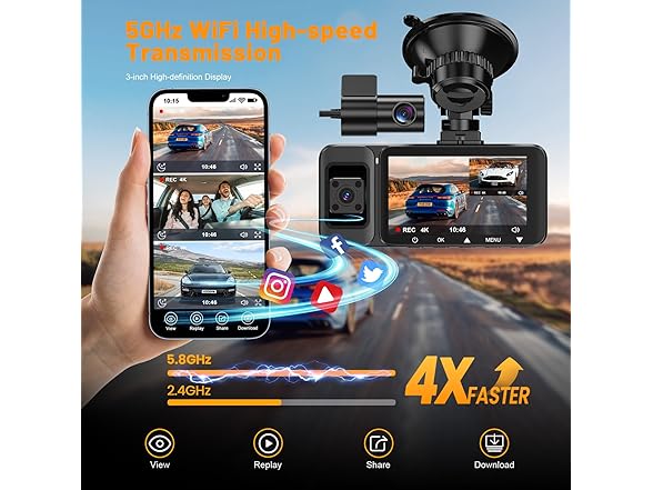 - 【5GHz WiFi High-Speed Connectivity】The dashcam features a built-in 5GHz high-speed WiFi module with transfer rates up to 8MB/s, nearly four times faster than traditional 2.4GHz models. Quickly preview and download HD videos via the mobile app, then effortlessly share them to social platforms with a single tap. (Effective connection range: approximately 3-5 meters)