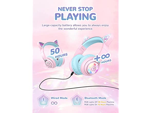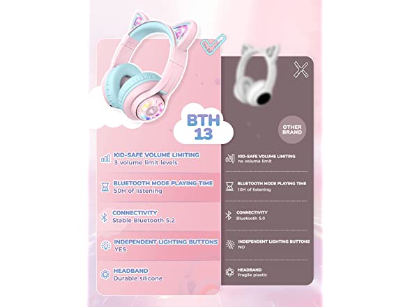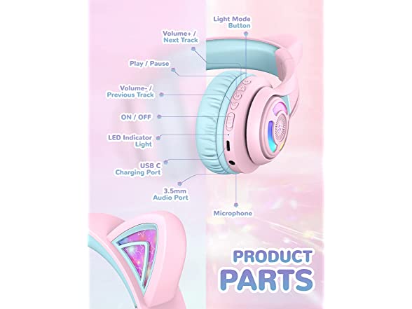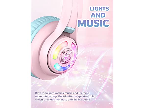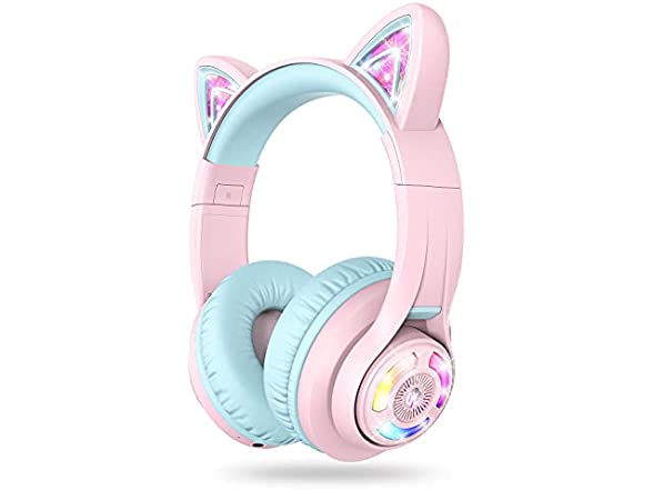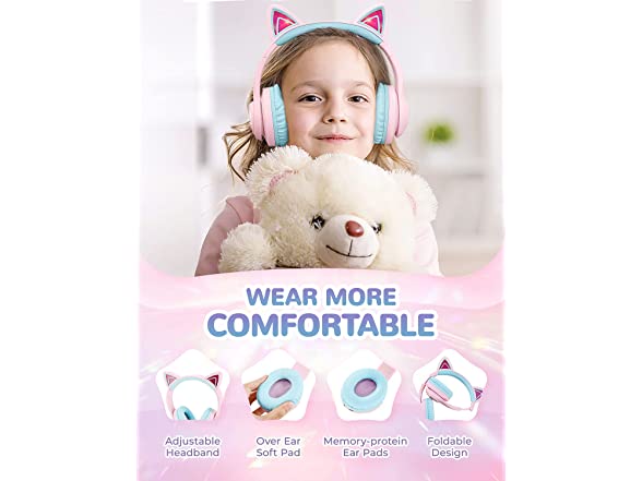 iClever Cat Ear Kids Bluetooth Headphones,LED Light Up Over Ear Kids Wireless Headphones with Mic,74/85/94dB Volume Limited,50H Playtime,Bluetooth 5.2,Pink Headphones for iPad/Tablet/PC/Travel,BTH13
