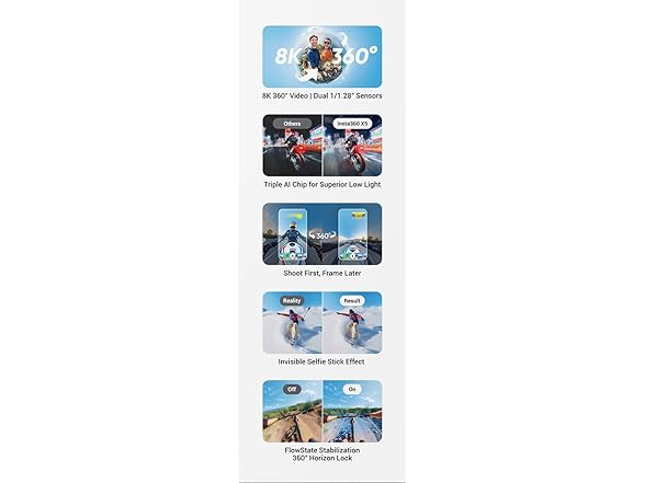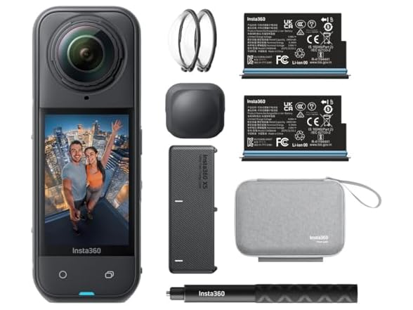 Why Choose X5?8K30fps 360 Degree Video with Dual 1/1.28" SensorsLarger 1/1.28" sensors capture more light for brighter, richer visuals and mind-blowing 8K30fps 360 Degree video.Triple AI Chip for Superior Low LightAn industry-first triple AI chip and new PureVideo mode deliver incredible breakthroughs in 360 Degree low light shooting.Invisible Selfie Stick EffectCapture third-person angles and drone-like views that are impossible with other action cameras, no stick in sight.New InstaFrame ModeThe new way to shoot and share. Capture a ready-to-share flat video and a 360 Degree video at the same time.Tougher, Replaceable LensesRisk the shot with our most durable lenses ever, now with a revolutionary replaceable design. Swap them out and get back to the action in no time.New Wind Guard for Clearer AudioCome through loud and clear with a multi-layer steel mesh Wind Guard and refreshed audio algorithms to silence wind noise.185 Mins Battery LifeA 2400mAh battery offers up to 3 hours in smart power-saving Endurance Mode, with fast charging powering you to 80% in just 20 minutes.Flowstate Stabilization + 360 Degree Horizon LockWaterproof to 49ft (15m) to explore deeper than ever, with FlowState Stabilization and 360 Degree Horizon Lock for buttery smooth shots no matter what.Flagship Imaging, Flagship Everything - T