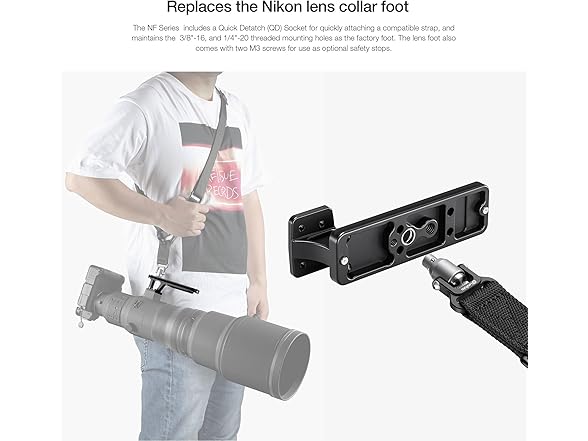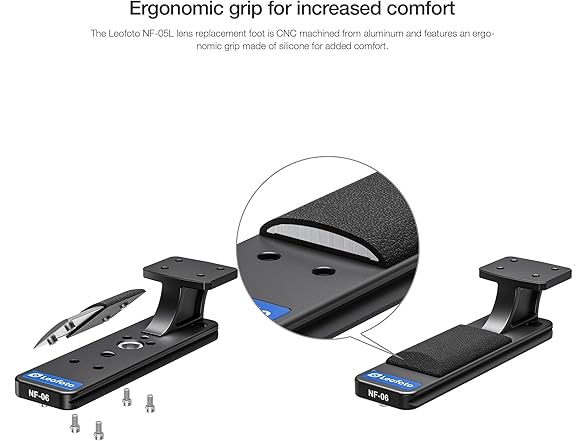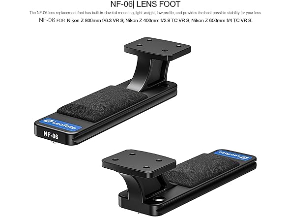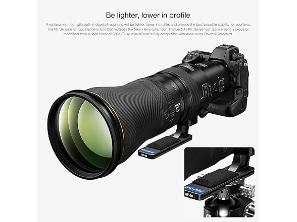 - Aiming to improve on the default design, the Leofoto NF-6 replaces Nikon's original lens collar foot and provides a lower profile and a lower center of gravity for better balance. Two safety stops are located on the bottom of the foot, which prevents accidental lens release when a quick-release receiver clamp is partially open.