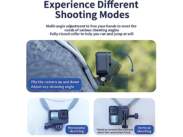 - Multiple POV Angle Adjustable- Not only achieve Horizontal and Vertical shooting purpose for mobile phones and sport cams, the included centered angle mount can help fix your camera and phone to the center position, it would show actually picture and video what you saw from your neck and chest.