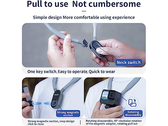 - Magnetic Lock/Unlock Design- TELESIN used magnetic connecting technique on this creative neck mount, say goodbye to the tedious installation and disassembly process, just one step to lock and one step to release!