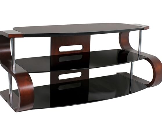 Add sophisticated style to your living space with the Metro Series 120 TV Stand. Features curved dark wood veneer and modern opaque black tempered glass shelving, this TV stand is a solid piece of beautiful furniture.