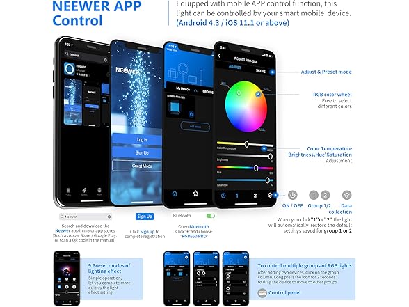 - 【Intelligent APP Control】You can set the channel (1-8/ALL) and adjust the color temperature/brightness/HSIparameters/Scenes through the button and knob on the panel with clear LCD screen or by downloading "NEEWER" APP in such as Apple Store/Google Play, etc through your smart mobile device (Android 4.3 or IOS 11.1 or above) for easy operation (Please Make sure the Bluetooth signal shows up on the LCD screen). 2 sets of parameters can be saved