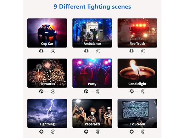 - 【Built in Applicable Scenes Modes】 This light for photography adopts a constant current control design which brings better effect for video shooting with no stroboscopic phenomenon. This lighting & studio equipment supports 9 special lighting scenes to enrich your shooting environment, including Cop Car, Ambulance, Fire Truck, Fireworks, Party, Candlelight, Lightning, Paparazzi, TV Screen. The RGB video light can meet your different needs in different situation