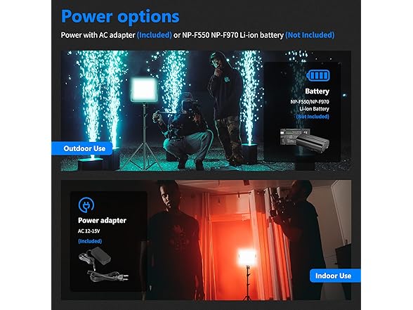 - 【AC/DC Power Options】 Support AC adapter (included) when shooting indoors, or NP-F550 NP-F970 Li ion battery power supply (battery not included). Mount it onto a tripod light stand (not included) for studio professional lighting