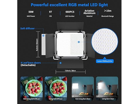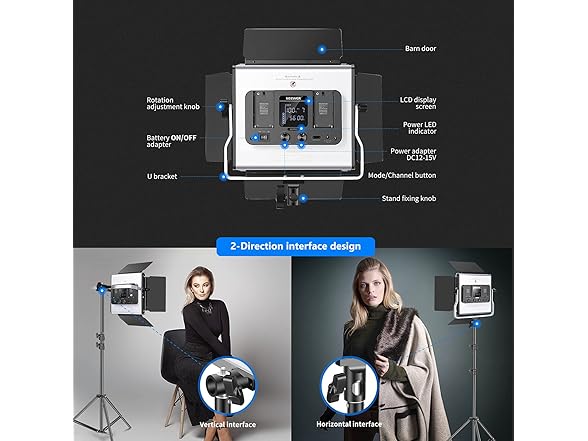 - 【Aviation Level Material & Photography Accessories】 Made of quality aluminum alloy with heat dissipation. Horizontal and vertical interface. U mount bracket enables photographers to adjust the lighting angle. Attaching barn doors make light sources create a beam spread of light. A white diffuser to soften the harsh light. Used as a key light or a fill light to help YouTube/TikTok or other social media content creator, influencers, live streamers to create fascinating videos