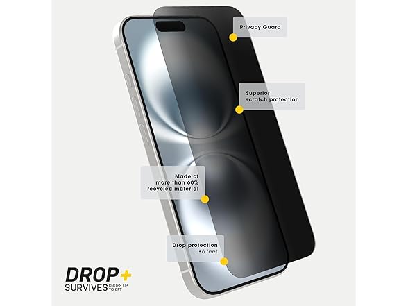 OtterBox Premium Pro iPhone 16 Pro Max privacy screen protector guards your display and blocks unwanted viewing while providing drop protection up to 6 feet. Developed for scientifically superior scratch resistance and featuring antimicrobial technology, OtterBox Premium Pro Glass defends your display.