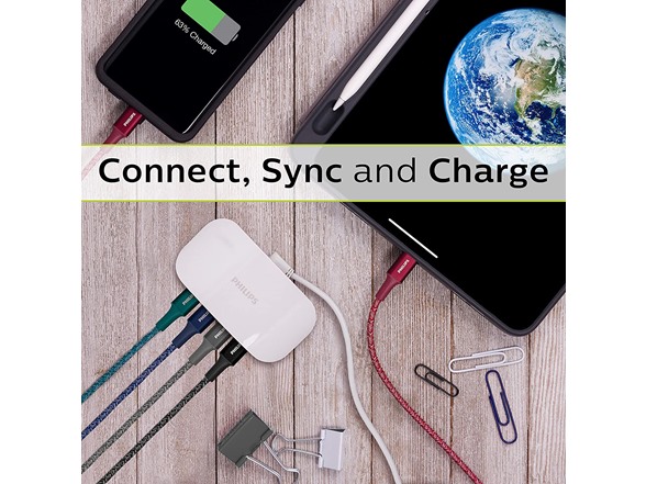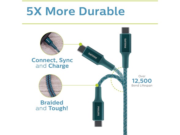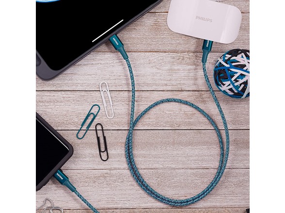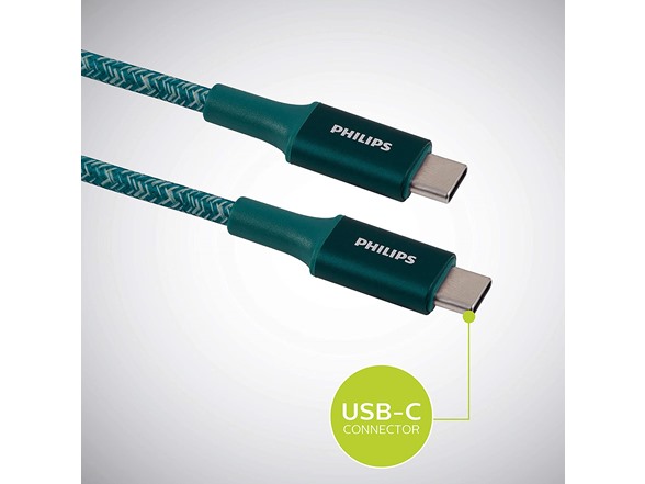 If your life is driven by the latest technology, then you need the Philips USB-C charging cable to power your newest gear. The durable aluminum connector heads are rated to withstand 12,500 bends to ensure a strong connection and also offer a sleek and intuitive design. The stylish braided cable is 5x stronger than most cables. The USB-C connector is also reversible, with no up or down orientation, attaching easily on the first try. Featuring forward-thinking innovation, USB-C is quickly becoming the industry standard for charging and powering laptops, tablets, smartphones and more. Experience state-of-the-art technology alongside real-world functionality, with a Philips USB-C charging cable.