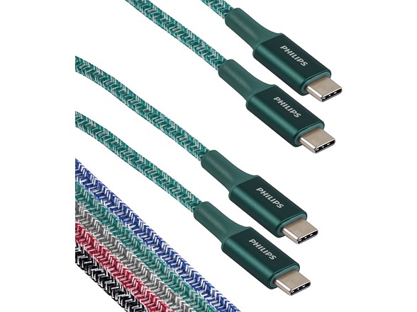 In the Box:- (1) Philips 6 Ft USB Type C Cable 2 Pack, USB-C to USB-C Emerald Braided Charging Cable, Compatible with iPad Pro, MacBook Pro, Samsung Galaxy S21/S10/S9/S8/Plus, Google Pixel 5/C/3/2/XL, DLC5226EC/37
