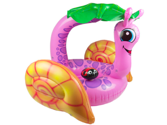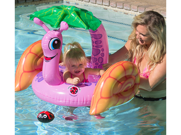 Poolmaster’s Snail Baby Rider if full of color and fun detailing. The Snail Rider features inflatable side shells that add stability on the water, while the long tail curves up and over to hold a leaf canopy that helps to protect baby from the sun. Two large antenna stand at attention on top of the snails head. A removable inflatable ladybug toy is included for baby to squeeze and stay entertained while getting comfortable in the water. Drop seat features ample leg room and provides confident and comfortable sitting. Made in 10-gauge vinyl and recommended for ages 8-24 months.