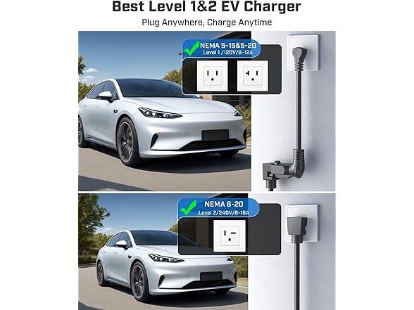 - [LEVEL 1 & 2 PORTABLE CHARGER — CHARGE ANYWHERE, ANYTIME] Designed for maximum flexibility, Raylix Level 1 & 2 EV charger features both 5-15 and 6-20 plug compatibility. Whether you're charging in your garage, at a friend's house, or at a roadside motel. NEMA 6-20 plug for Level 2 ev charging (240V, 16A, 3.68kW, 9-12 miles/hr) and a NEMA 5-15 adapter for Level 1 ev charging (120V, 12A, 1.44kW, 3-5 miles/hr) NOTE: In compliance with North American electrical safety standards, the charger automatically limits current to 12A when using a 5-15 outlet—protecting both your vehicle and your home’s electrical system.
