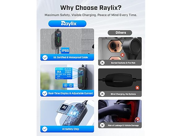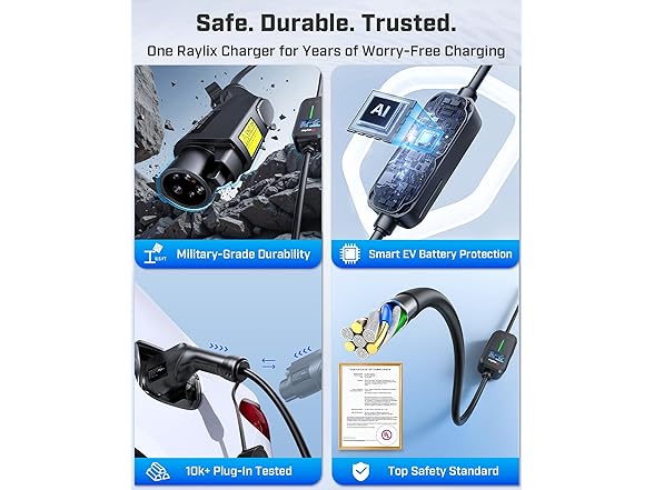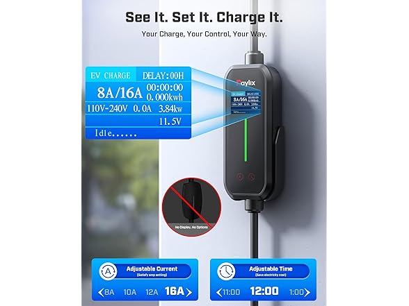 - [2025 INTELLIGENT CHARGING UPGRADE — PRECISION CONTROL MEETS SMART SCHEDULING] After surveying 100K+ U.S. EV owners, the Raylix R&D team found that nearly all drivers recognized the necessity of adjustable current and scheduled charging. Our upgraded J1772 charger features 4-level adjustable current (8A/10A/12A/16A) and a 1–12 hour smart delay timer. Whether you're charging overnight or during off-peak hours, enjoy smarter energy use, lower costs, and total convenience—on your schedule.