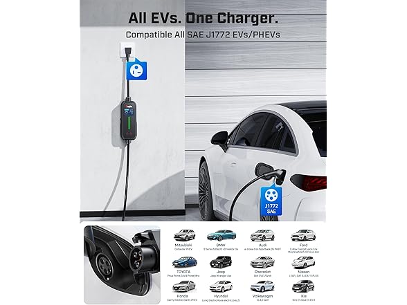 - [ONE CHARGER, ALL J1772 EVs/PHEVs READY!] Compatible with all SAE J1772 electric vehicles and plug-in hybrids—whether it’s Ford, GM, Nissan, Audi, BMW, Kia, Hyundai, Honda, Chevy, or more. Perfect for home or on-the-road charging, our 16A Level 1 & 2 charger ensures your EV is always powered and ready for any journey.