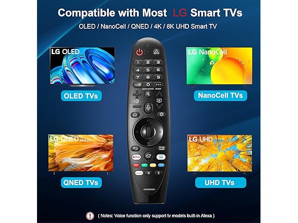 - đ„ăApplicable TV SeriesăReplacement magic voice remote control fit for LG smart TV, UHD TV's UP70, UP75, UP76, UP80, UP87, UN85, UN73 Series, OLED TV's OLED A1, OLED B1, OLED C1, OLED G1 Series, QNED Mini-LED TV's QNED 90, QNED 99 Series, NanoCell TV's Nano 75, Nano 80, Nano 85, Nano 90, Nano 99, ZX, WX, GX, CX, BX,Series etc.