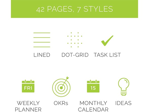 - No more wasting paper - this environmentally friendly 42 page notebook has 7 different page styles for planning, listing, goal setting, note-taking, sketching, and sharing big ideas
