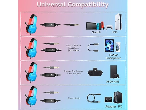- Wired Compatibility: Compatible with Nintendo Switch, Smartphones, Wii, 3DS, Windows PC, Mobile, Tablet, iPad, Mac, VR Devices. This gaming headset is versatile and can be used with almost all game consoles that have a 3.5mm jack. Please note: When using the headset on a PC, ensure to connect the included 1-to-2 3.5mm audio jack splitter cable for optimal performance. Please note you need an extra Microsoft Adapter (Not Included) when connect with an old version Xbox One controller