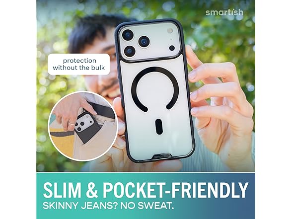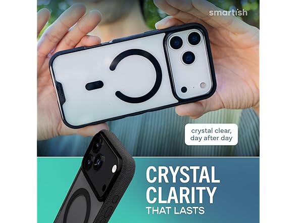 The clear case that actually stays clear. Gripmunk Clear by Smartish is a lightweight, protective iPhone 17 case designed for real life, with the perfect combo of MagSafe strength, long-lasting clarity, and everyday grip. Drop-tested 50 times from 6 feet, Gripmunk doesn’t flinch. Shock-absorbing air pocket corners cushion your phone during slips, fumbles, and those unexpected oops moments. It’s slim enough to slide into your jeans or bag, but tough enough to take a beating. Built with extra-strength magnets under the surface, this case locks tightly onto MagSafe chargers, wallets, and car mounts. Whether you're heading out the door or hopping into the car, Gripmunk stays put through every bump and turn. The anti-yellowing material resists discoloration from sunlight, sweat, and everyday grime. Your phone stays clean, crisp, and crystal clear day after day. No weird tint, no crusty fade, just a sharp look that lasts. Gripmunk also features textured sides and finger grooves, giving you a secure grip without pocket snags or awkward slips. It’s comfortable in hand and ready for snappy selfies, scrolling, and all-day use. Raised edges around the screen and camera create a safety buffer, helping you avoid scratches whether it’s face-down on a table or sliding across a counter. If you're looking for a case that protects without hiding your phone, Gripmunk Clear is it. It’s sleek, dependable, and made to keep your iPhone looking fresh and feeling safe, wherever your day takes you.
