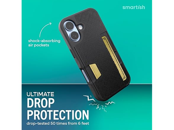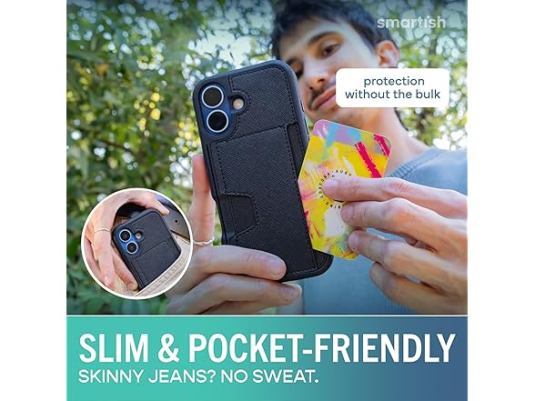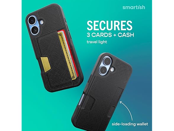 Wallet Slayer Vol. 2 by Smartish is your all-in-one phone case and minimalist wallet, designed for people who want to carry less and still have it all. It's slim, protective, and clever enough to kick back while you binge your favorite shows. The patented spring-loaded, side-loading design securely holds 1 to 3 cards plus cash. There are no moving parts to break, and your essentials stay snug and ready to go. Whether you're headed to the store or the airport, your wallet is already in your hand. Drop-tested 50 times from 6 feet, this case features built-in air pocket corners that absorb shock like tiny cushions. From everyday slips to unexpected drops, Wallet Slayer Vol. 2 is built to take the hit so your phone doesn’t have to. It also features a clever credit card kickstand built right into the card slot. Just slide a card halfway in and boom, hands-free viewing for video calls, streaming, or scrolling while you eat tacos with both hands. No hinges, no bulk, just smart function. With its textured sides and grippy feel, it’s easy to hold onto and won’t snag in your pocket. The slim build slides smoothly into jeans, bags, or jackets without bulking up your everyday carry. Wallet Slayer Vol. 2 is not compatible with MagSafe or wireless charging, but the tradeoff is worth it. You get protection, convenience, and a built-in kickstand, and cable charging is faster anyway. If you want to simplify your life and cut the clutter, Wallet Slayer Vol. 2 does the job. Cards, cash, phone, kickstand. Done.