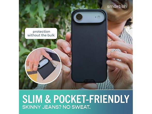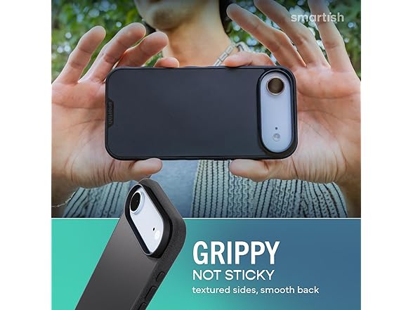 Meet Gripmunk by Smartish, a slim and protective iPhone 17 case built for everyday life. From slip-ups to selfies, this case is ready to handle it all without adding unnecessary bulk. Gripmunk is drop-tested 50 times from 6 feet and features air-pocket corners that absorb shock like mini airbags. Its upgraded design also fully covers the new iPhone Camera Control button, giving you smooth and responsive access for snapping, zooming, and scrolling without delay. Whether you're capturing a quick shot or adjusting your view, the button stays protected and easy to reach. Inside the case, hidden behind a soft microfiber lining, you'll find extra-strength magnets that align perfectly with MagSafe accessories. From wallets and chargers to car mounts and wall setups, Gripmunk locks in tight and stays secure, even when life gets bumpy. The textured sides and ergonomic finger grooves give you a confident grip that wonβt cling to your pocket or slip from your hand. Designed with comfort in mind, it helps prevent drops without feeling bulky or sticky. Raised edges around the screen and camera add an essential layer of scratch protection. You can place your phone face-down, toss it in your bag, or survive the occasional drop without stressing over scrapes or scuffs. Slim enough for tight pockets, purses, or gym bags, Gripmunk keeps your iPhone protected without feeling like a tank. Itβs the perfect balance of durability, comfort, and everyday usability. No frills. Just solid, smart protection that gets the job done.
