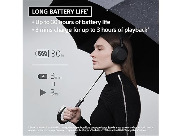 - LONG BATTERY LIFE AND CONVENIENT CHARGING: With up to 30 hours of battery life, these headphones ensure you’re powered for even the longest trips. When you’re running low, simply plug in the USB charging cable and keep listening, with both Bluetooth and audio cable connections supported. Charge for 3 minutes and you’ll get up to 3 hours of playback with an optional USB-PD compatible AC adapter.