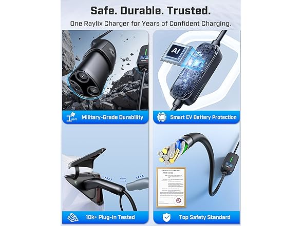 - [BUILT FOR SAFETY & DURABILITY] Our professional team has conducted over 100K+ charging safety tests to ensure peace of mind with every use. This tesla Mobile connector is equipped with advanced protection features—including overheating, overvoltage, and overcurrent protection—and has earned both FCC and CE certifications. Its smart control box features an intelligent monitoring chip that continuously tracks charging status in real time. The enclosure is rated IP65 for water resistance and UL94V-0 for flame resistance, guaranteeing top-tier safety in any environment. With Raylix, every charge is safe, secure, and worry-free.