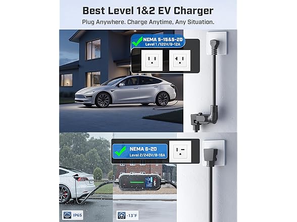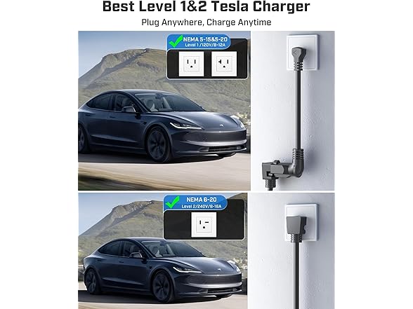 - [LEVEL 1+ 2 TESLA CHARGER — CHARGE ANYWHERE, ANYTIME] Designed for maximum flexibility, Raylix tesla mobile connector features both 5-15 and 6-20 plug compatibility. Whether you're charging in your garage, at a friend's house, or at a roadside motel. NEMA 6-20 plug for Level 2 tesla charging (240V, 16A, 3.68kW, 9-12 miles/hr) and a NEMA 5-15 adapter for Level 1 tesla charging (120V, 12A, 1.44kW, 3-5 miles/hr) NOTE: In compliance with North American electrical safety standards, the charger automatically limits current to 12A when using a 5-15 outlet—protecting both your vehicle and your home’s electrical system.