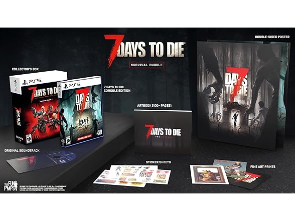 - A must-have for collectors and fans of Open-World Survival Horror, the 7 Days to Die – Console Edition Survival Bundle includes the following: An exclusive Artbook with over 100 pages showcasing never-before-seen illustrations of the zombie apocalypse, a CD featuring the haunting Original Soundtrack (OST) of the game, a double-sided poster, Fine art prints x3, Sticker sheets x 3, the physical game, and a collectible tuck-in box housing all the contents.