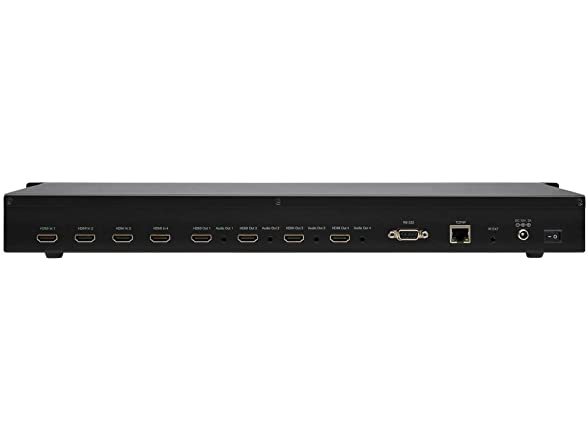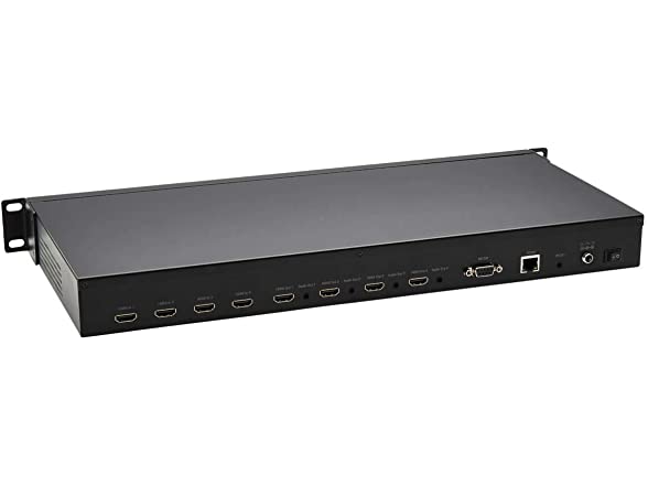 - GREAT FLEXIBILITY IN TRANSMITTING VIDEO TO DIFFERENT DISPLAYS OR ROOMS: Send the same video image to all displays or transmit different videos to different displays and switch between them. Convenient push buttons on the front of the unit let you instantly choose which sources and displays to highlight. You can also use the included IR hardware, RS-232 serial commands (cable sold separately) or the included GUI software to pick and choose. Remote access of the matrix switch/splitter is possible by configuring your network to match its pre-assigned IP address.