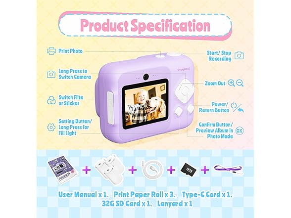 - Complete Kit: The product includes 1x kids camera, 3x paper rolls, 32GB SD card, USB-C charging cable, children's lanyard, user manual and beautiful product packaging box. It's the kid camera set, ready to use right away. Whether your child is new to photography or loves being creative, this instant print camera makes it easy to capture and print memories.It is very suitable to be given as a festival gift to children, encouraging them to actively record their lives.