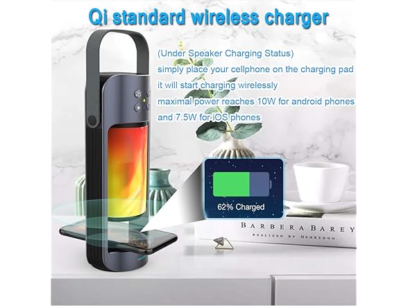 - 👍Fast Wireless Charging:Our Bluetooth speaker not only delivers premium audio quality but also features a fast wireless charging function that supports a 10W output. Simply use the included 2A data cable to connect it to an external power source, and you can power up your device wirelessly. Moreover, in emergencies, use our product as an emergency power bank. Its USB port outputs 0.5A current to keep your mobile phone charged for continuous usage.