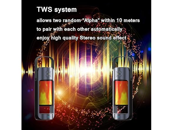- 👍Seamless In-Ear Connection:With our Bluetooth speaker, you can effortlessly pair any two Alpha devices at the same time, or turn on the other device when one of them is already turned on. The two devices will automatically synchronize a'er around 5 seconds, giving you a seamless in-ear connection that produces le' and right channels for an immersive listening experience. Whether you're streaming music or taking calls, our speaker ensures uninterrupted synchronization and operation.