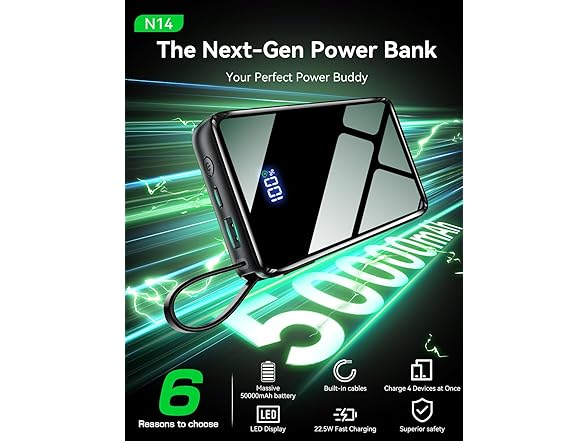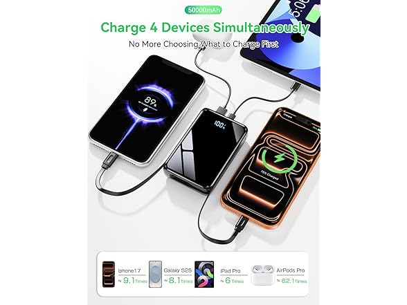 - 50000mAh Massive Capacity & Charge 10+ Times Power 4 Devices Simultaneously With a colossal 50000mAh battery,the power bank delivers extended battery life for all your devices. It can recharge a smartphone up to 10 times, a tablet 5 times, and earbuds over 20 times. Perfect for long trips, camping, business travel, and emergency backup. Equipped with dual built-in cables & one Type-C port & one USB-A port, it supports charging up to four devices at once—ideal for families, group outings.